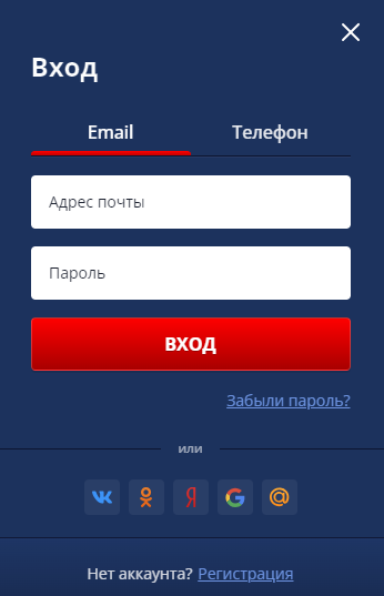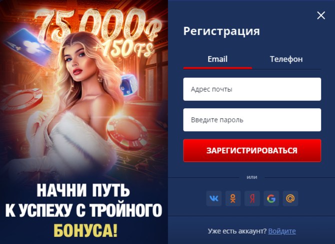 Также есть возможность авторизоваться в системе через профиль в социальных сетях и почтовых сервисах. В онлайн казино предлагается использовать для входа в личный кабинет учетную запись в ВКонтакте, Одноклассниках, Яндексе, Гугле или mail.ru.